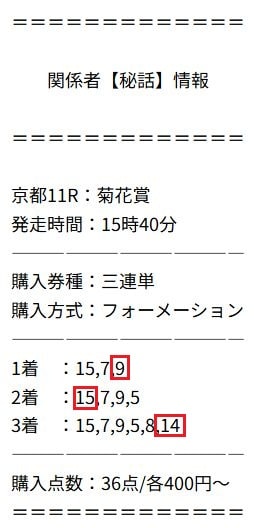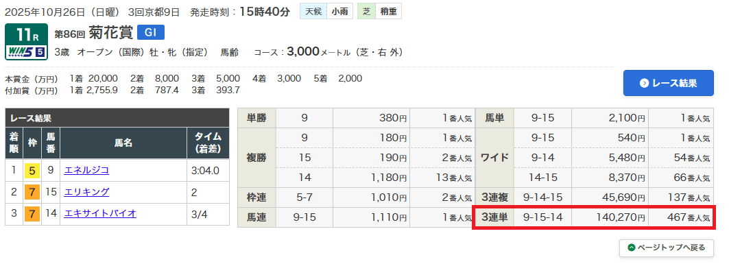 今回は1点400円の馬券代(合計14,400円)で挑んだ菊花賞、3着に入った13人気エキサイトバイオの馬券内を見抜いてナント3連単1402.7倍もの攻略を成功させた!