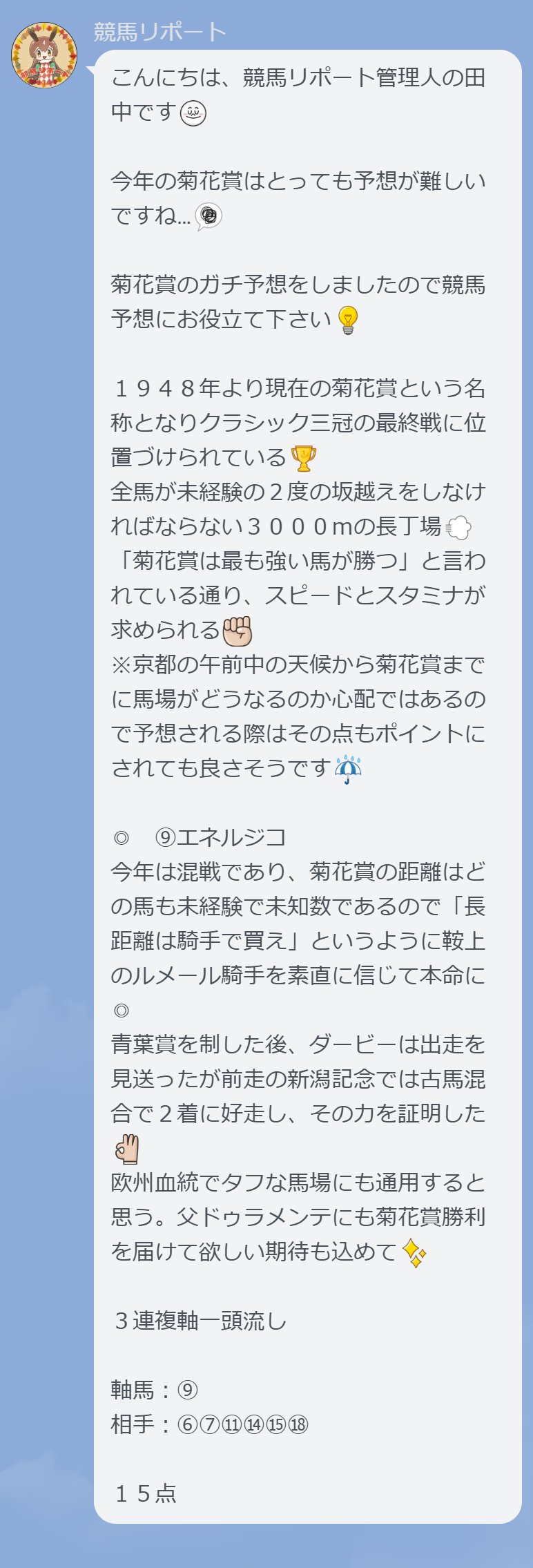 最後に、先週のG1菊花賞ガチ予想で456.9倍的中させた管理人の予想限定LINEアカウントをご紹介しているので是非チェックして友だち追加してください。