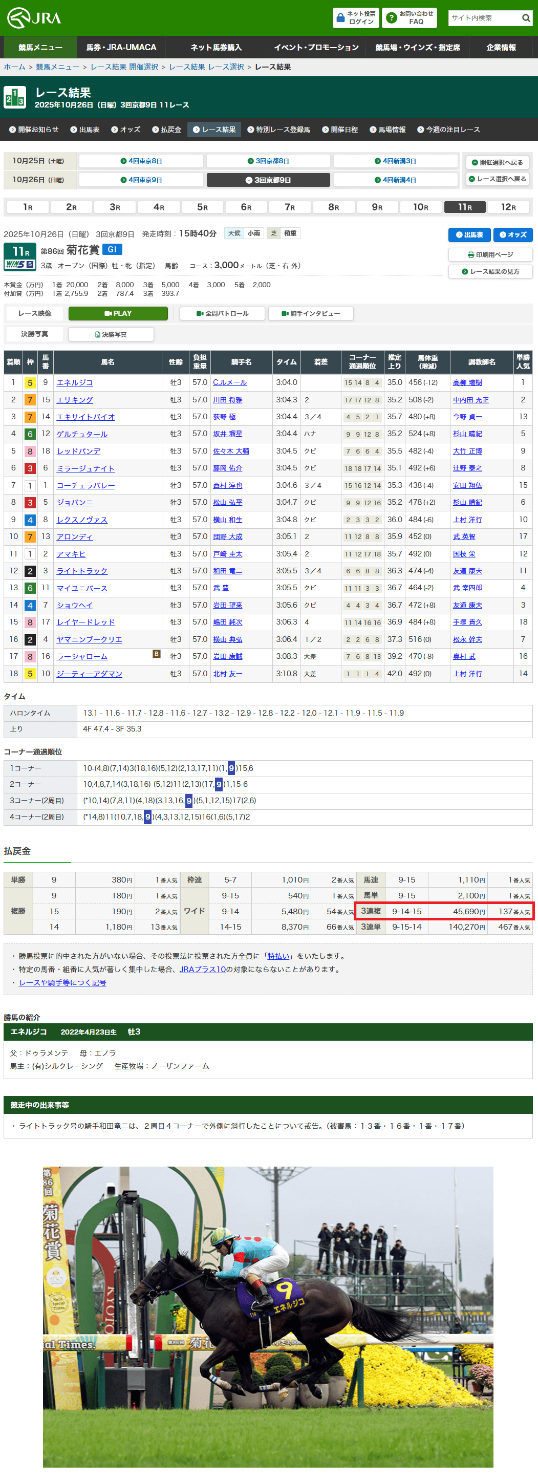 3歳クラシックの掉尾を飾る第86回菊花賞(GⅠ・芝3,000m・京都)。稍重の馬場で行われた長丁場の決戦を制したのは、1番人気エネルジコ(牡3・C.ルメール騎手)。タイムは3分04秒0。2着にエリキング、3着には13番人気のエキサイトバイオが健闘しました。