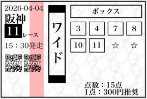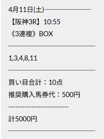 4/11のPT情報、阪神8R当たり。最後まで4と9の叩き合いでヒヤヒヤしたけど、結果9-4-8。払戻43万見てホッとした。無駄のない的中。