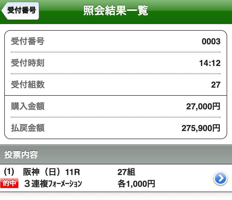 そんな簡単に勝てるなら世話ないだろって感じで利用して1年以上 あんまり口コミとか、食べログとかも書かないけど異常すぎるので結果だけと 桜花賞の3着入ったジッピーチューンは痺れましたね。 最後方からごぼう抜き、オークスでは人気になりそうだけど桜花賞で人気無いうちに獲れて満足 99万2520円払戻し