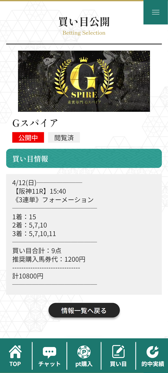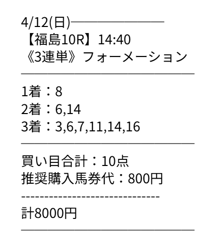 先週の大阪杯のレビューみて利用してみました。 3連単推奨でしたけど3連複でも充分配当あったのでよかったです。 さすがの本命馬でしたね、これとは別に馬単ももらいました。 ありがとうございます